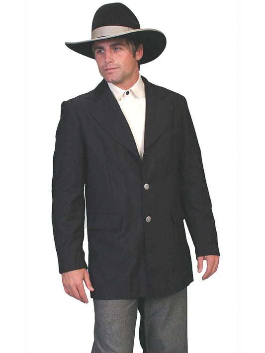 Old west frock coat with authentic tailoring and construction. Features two front flap pockets left chest pocket and two inside chest pockets. Two stamped metal buttons on back vent as well as on the front and cuffs. 100% polyester. Fully lined. Dry-clean only. Import....- $173.00 USD