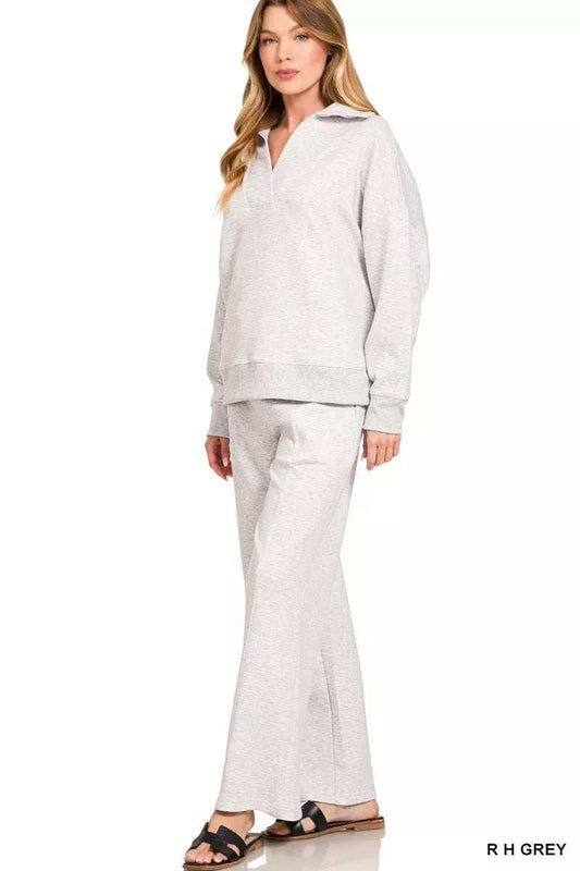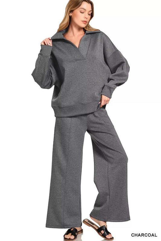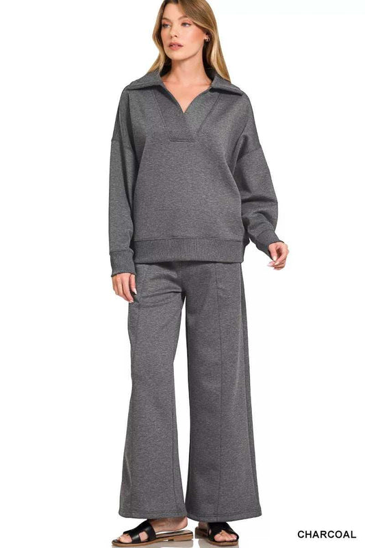 Step up your loungewear game with this sleek scuba collared pullover and pants set. The scuba material offers a modern and stylish look, while the collared design adds a touch of refinement. Perfect for relaxing at home or running errands in comfort and style....- $53.94 USD