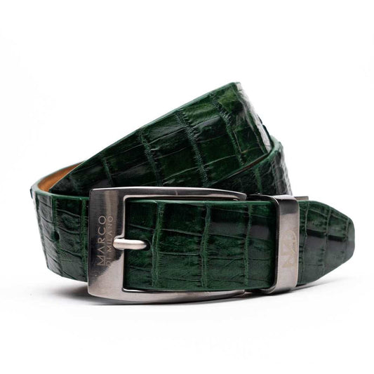 Finish your look with our genuine exotic caiman fuscus-belly belts, featuring beautiful hand-finishes and soft interior lining. The brushed chrome buckle features subtle Marco Di Milano branding, and it easily removable in case you need your belt trimmed to size. Genuine caiman fuscus-belly skin...- $295.00 USD