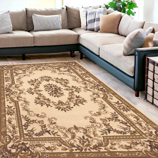 8' X 11' Ivory Machine Woven Hand Carved Floral Medallion Indoor Area Rug