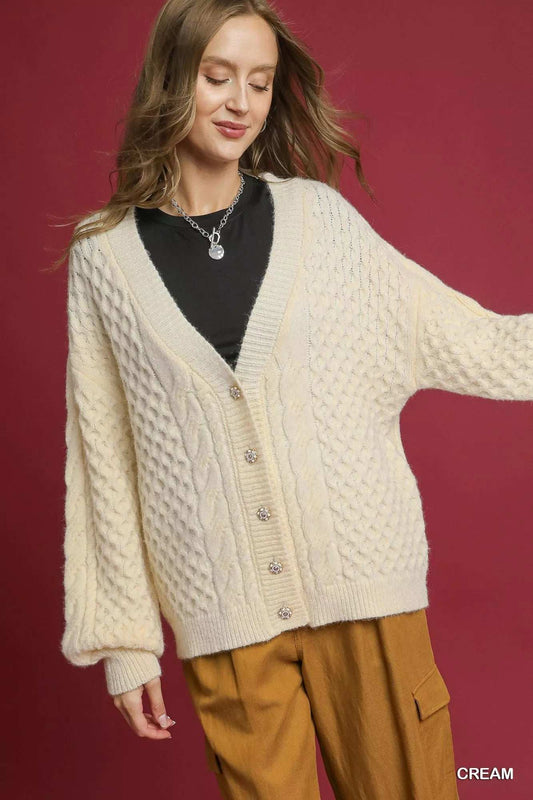 Umgee Chunky Cable Knit V-Neck Button-Up Cardigan