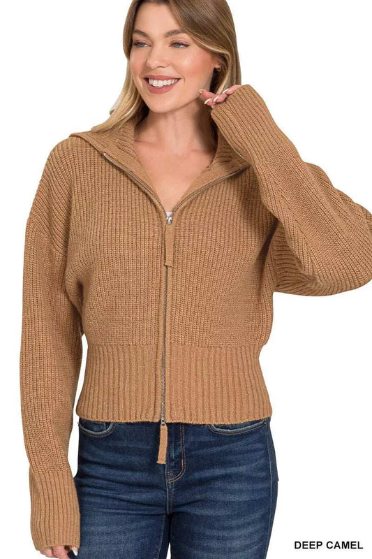 Zenana Ribbed Collared Zip Up Sweater Cardigan