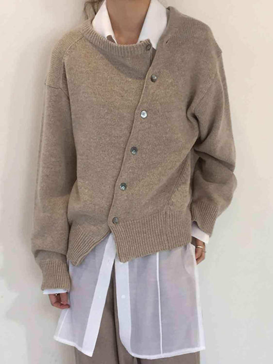 This button-front knit cardigan features a V-neck and a relaxed, slightly oversized silhouette that is both cozy and stylish. The ribbed hem and cuffs add a touch of texture to the design. Perfect for layering, this cardigan is ideal for adding a casual and...- $67.94 USD