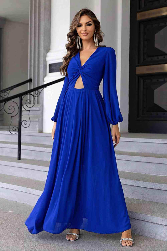 V-Neck Long Sleeve Tie Waist Midi Dress