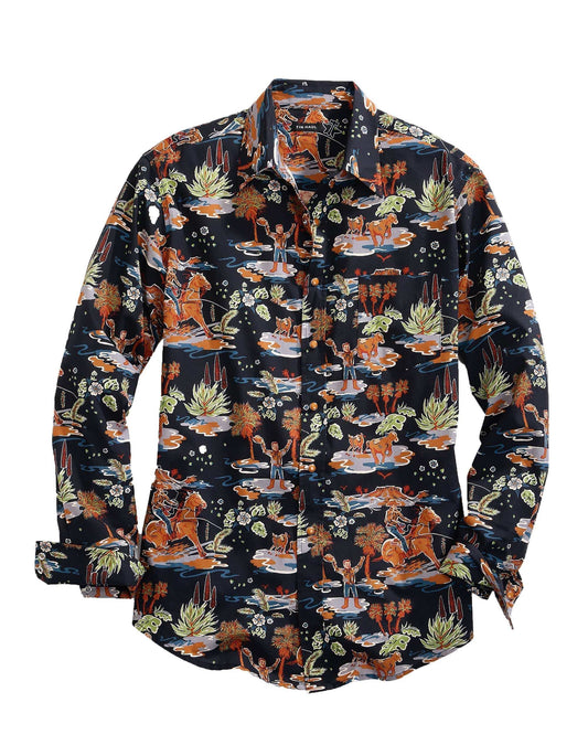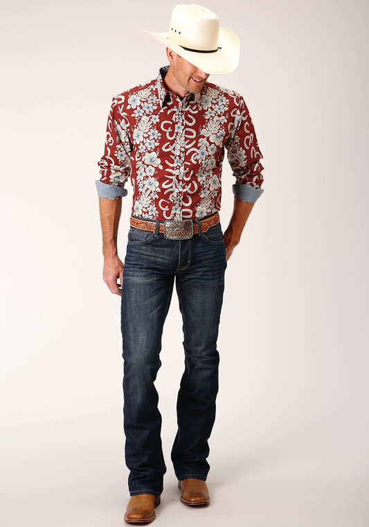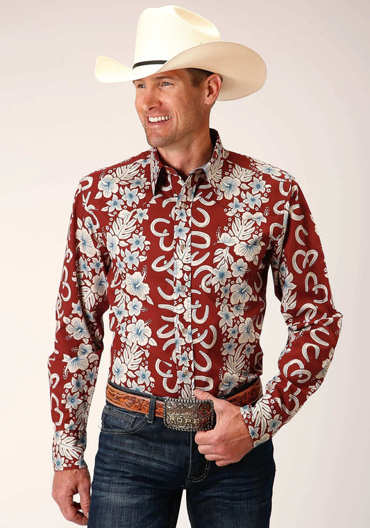 Roper Mens Long Sleeve Snap Hawaiian Horseshoes Print Western Shirt