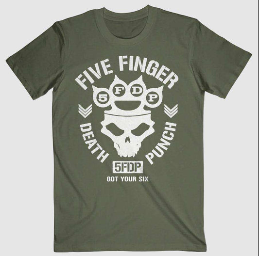Rock to the fullest in this officially licensed, Five Finger Death Punch t-shirt. This green tee is a men's standard-fit with "Got Your Six" graphics. 100% cotton t-shirt. Machine washable. Print on demand.- From $21.95 USD