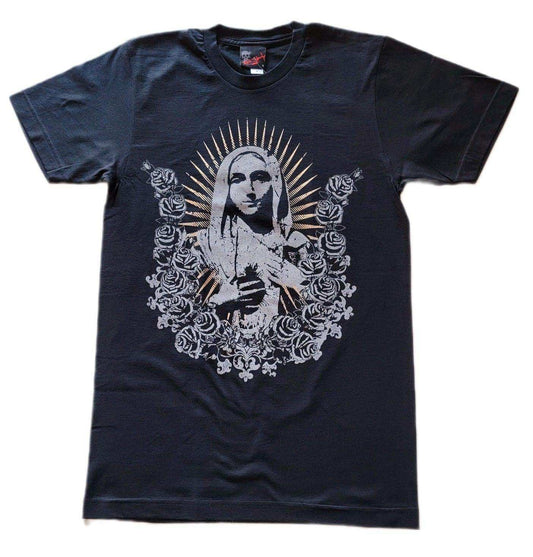 From our archives! We just found a rare Steady Clothing Guadalupe men's tee. This black graphic tee features an image of Guadalupe on front with silver foil print. 100% Cotton Machine washable Made in USA.- $19.98 USD