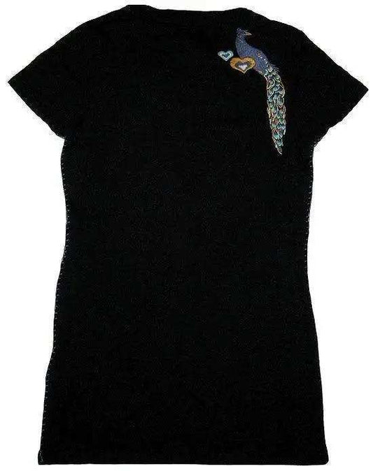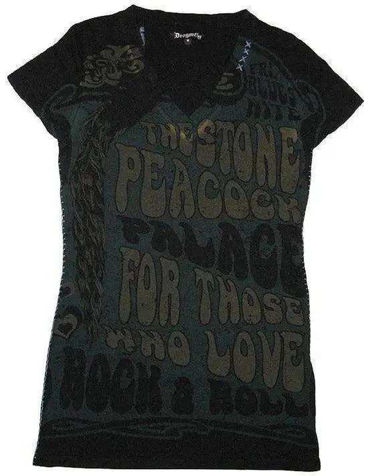 Ladies, check out this cute new shirt from Dragonfly clothing. This vintage washed black V-neck shirt features a retro screen-print design on front that reads ?The Stone Peacock Palace For Those Who Love Rock & Roll?. A colorful embroidered peacock is on back of...- $30.00 USD