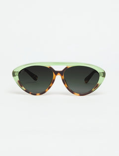 A lightweight, oval-shaped model with a double bridge that stands out for its subtle play of colour: vibrant shades such as green, blue or yellow that contrast with its already well-known green tortoise colour.
