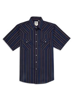 Kick back and keep it casual, cowboy. This short sleeve stripe shirt features all the classic western detailing, from the traditional yokes to front flap pockets and pearl snaps.