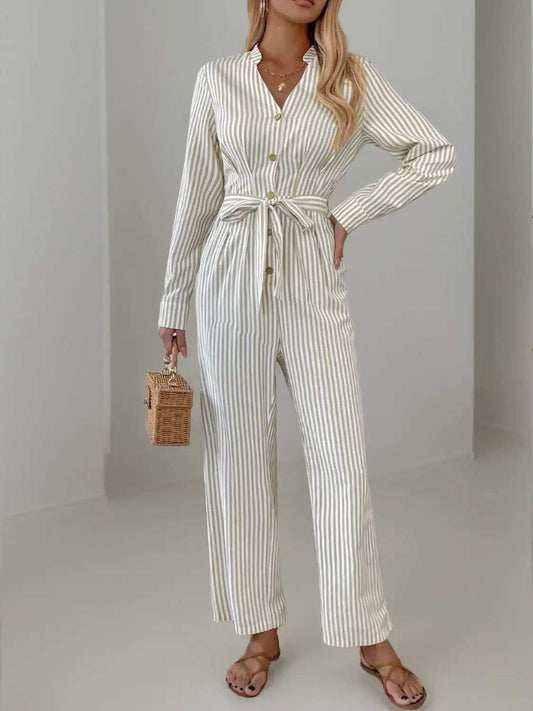 Striped Notched Long Sleeve Tie Waist Jumpsuit