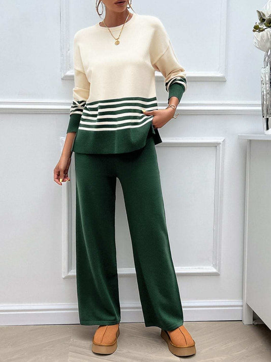 Devine Slit Striped Round Neck Top and Pants Sweater Set