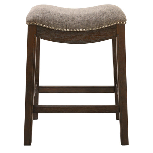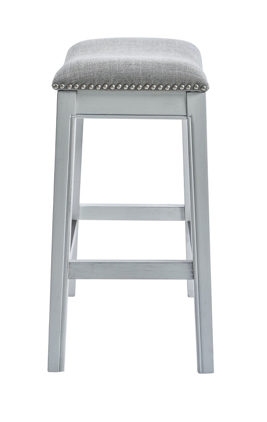 Comfort and style blend effortlessly in this modern bar chair featuring a light gray upholstered saddle seat and elegant nailhead trim detail. Crafted from solid wood, this bar height chair includes a convenient footrest for added comfort, making it both stylish and functional. The...- $167.97 USD