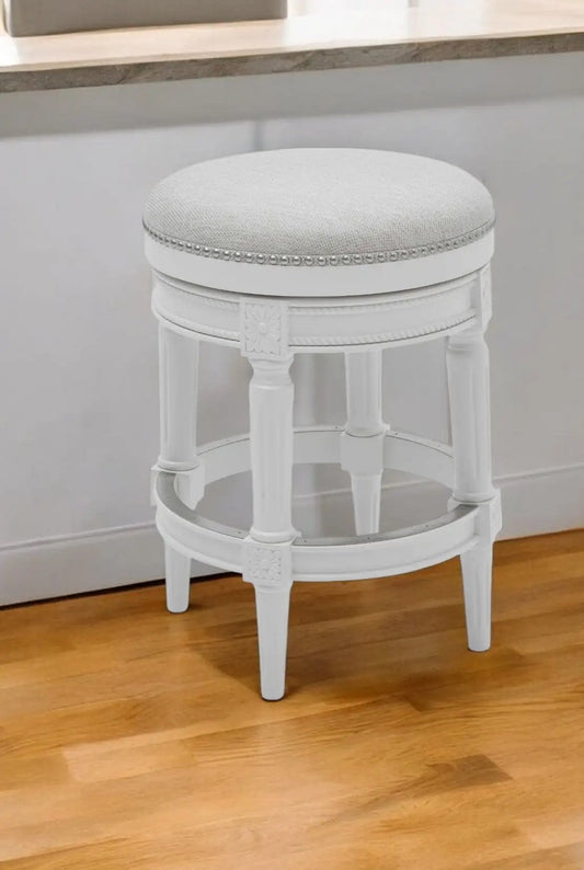 26" White Fabric And Solid Wood Swivel Backless Counter Height Bar Chair
