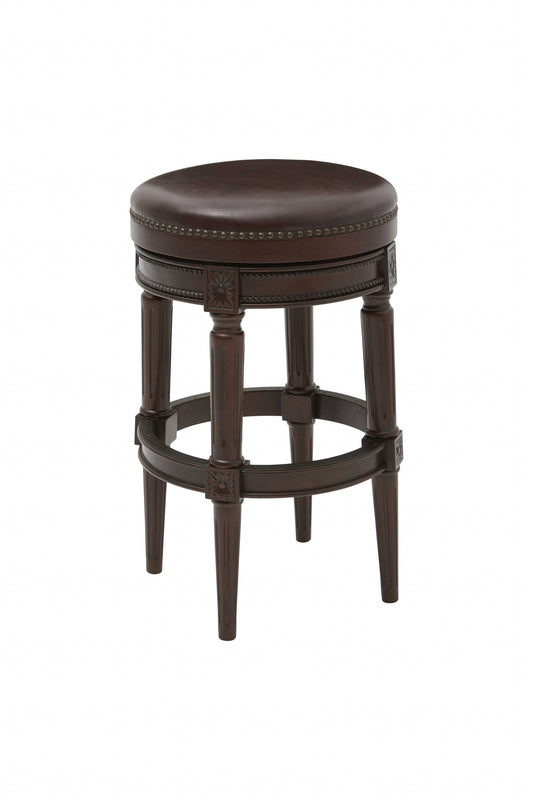31" Wood Brown Faux Leather And Solid Wood Swivel Backless Counter Height Bar Chair