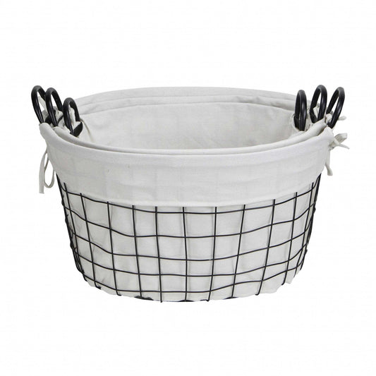 Set Of Three Black Oval Wire Baskets with White Fabric Liners and Handles