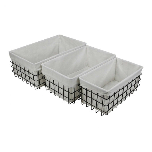 Set Of 3 Rectangular White Lined And Metal Wire Baskets