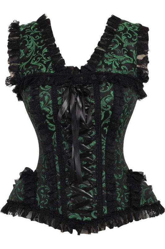 Daisy Corsets Top Drawer Green/Black Swirl Brocade & Lace Steel Boned Corset w/Cap Sleeves