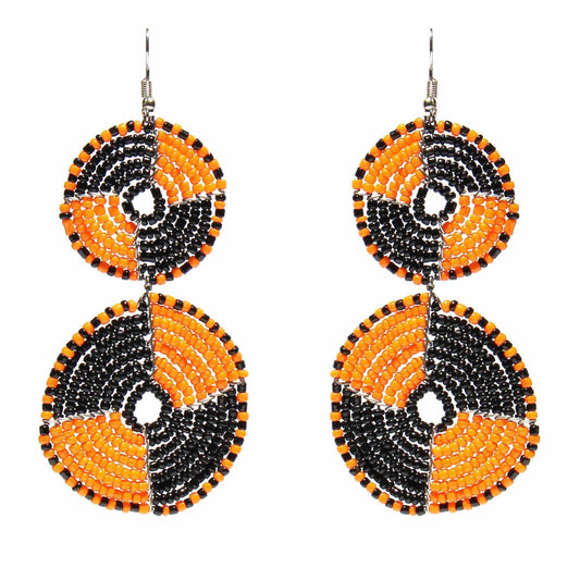 Maasai Bead Double Circle Dangle Earrings, Mango Orange and Black