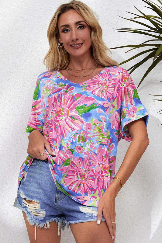 Pattern type: Abstract Style: Casual, Chic Features: Basic style Neckline: V-neck Length: Regular Sleeve length: Short sleeves Sleeve type: Regular sleeves Sheer: No Material composition: 95% polyester, 5% spandex Stretch: Slightly stretchy Care instructions: Machine wash cold. Tumble dry low. Imported Product measurements: S:...- $24.94 USD