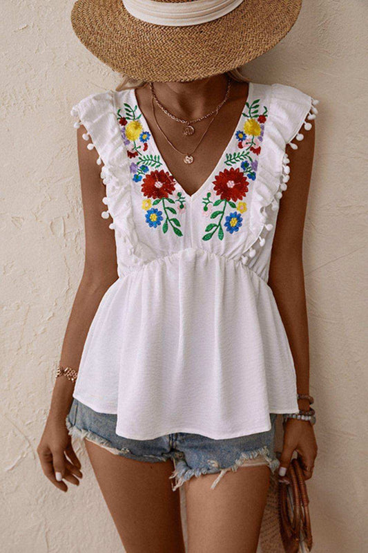 Embroidered Pom-Pom Trim Cap Sleeve Babydoll Top