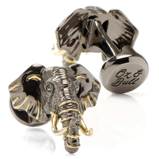 Expertly finished in gunmetal plated sterling silver with gold accents, these stunning and captivating cufflinks are sure to catch the eye. Designed with attention to detail, our Sterling Silver and 14K Gold Elephant Cufflinks resemble a realistic 3D Elephant head. The expert craftsmanship of...- $400.00 USD