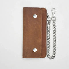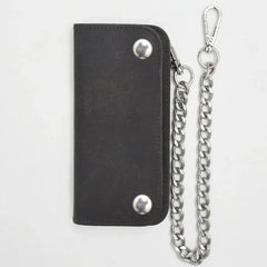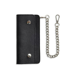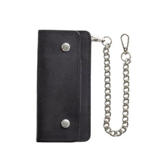 Our Large Trucker wallet makes a statement. This classic style will be visible from the back pocket of most denim and chino style pants. The Large Trucker wallet has more than enough room for all of your everyday items and features one card slot, one zipper pocket, and two large open pockets. We guarantee it will keep your most important items secure behind the double snap closure. The added grommet on the backside keeps the attached rust free chain secure. The 15 inch chain can be removed to replace with one of your choosing or if the occasion requires a cleaner look.