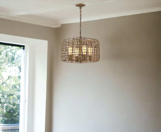 Lynden 4-Light Raw Brass Drum Pendant With Wire Cage Shade