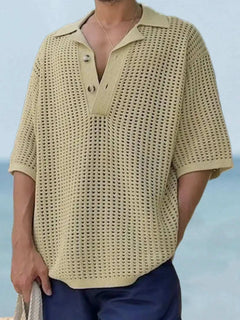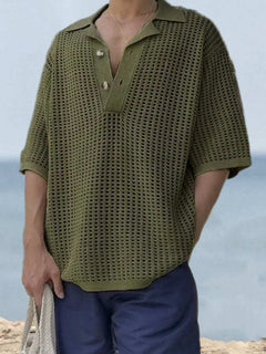 Men's Plus Size Openwork Collared Neck Quarter Button Knit Polo