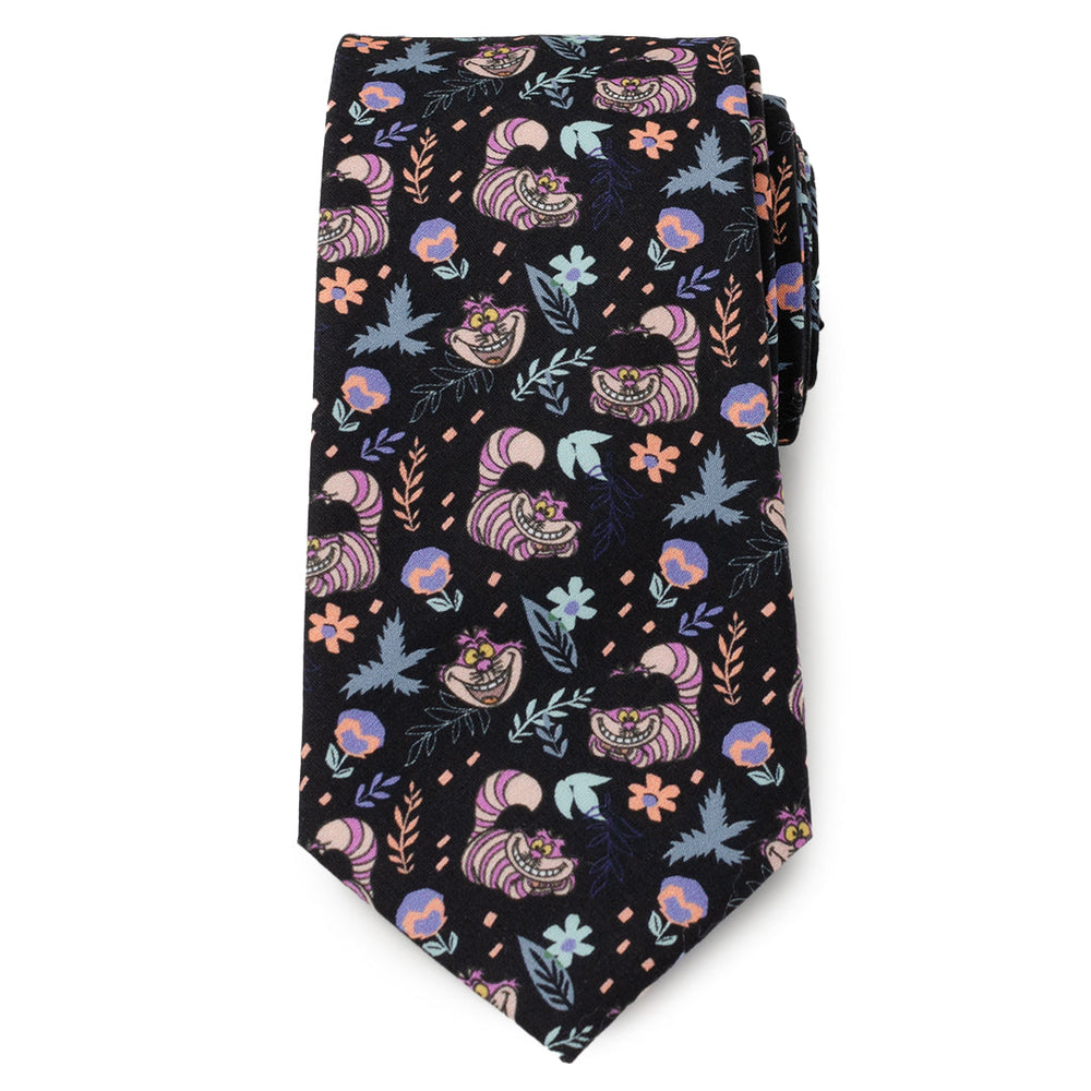 Let this be your portal to Wonderland! Designed with a dash of whimsy and mischief, our Alice in Wonderland Cheshire Cat Black Men's Tie features the ever illusive, yet charismatic Cheshire cat. Against the backdrop of sleek black, the iconic grinning feline emerges, its mesmerizing smile and sparkling eyes adding an enchanting touch to your ensemble. His cheeky smile is even on the reverse of the tie, just as if he isn't even there. Our tie will maintain its shape thanks to being crafted with sturdy yet breathable 100% Cotton. Officially licensed by Disney.