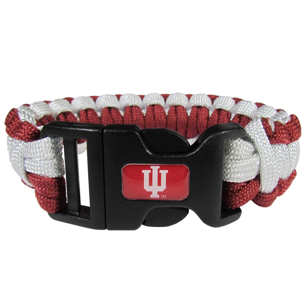Our functional and fashionable Indiana Hoosiers survivor bracelets contain 2 individual 300lb test paracord rated cords that are each 5 feet long. The team colored cords can be pulled apart to be used in any number of emergencies and look great while worn. The bracelet features a team emblem on the clasp.