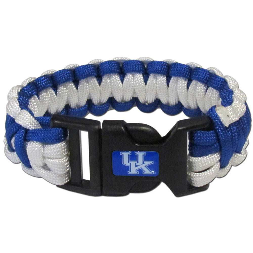 Our functional and fashionable Kentucky Wildcats survivor bracelets contain 2 individual 300lb test paracord rated cords that are each 5 feet long. The team colored cords can be pulled apart to be used in any number of emergencies and look great while worn. The bracelet features a team emblem on the clasp.