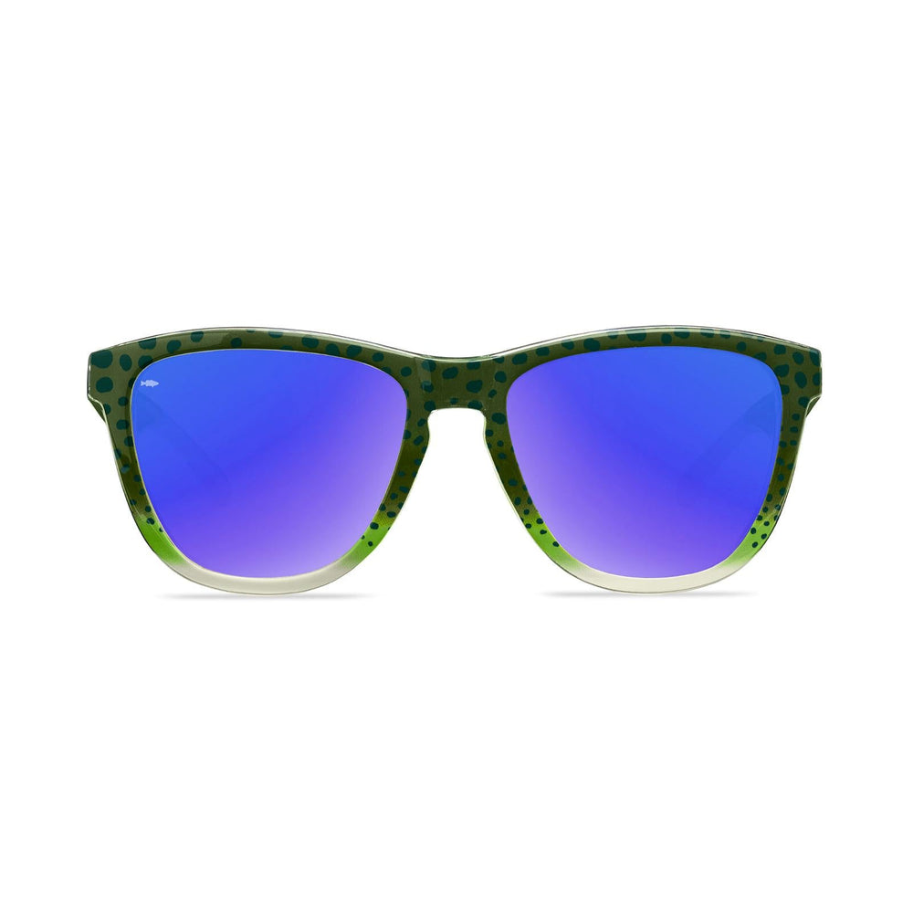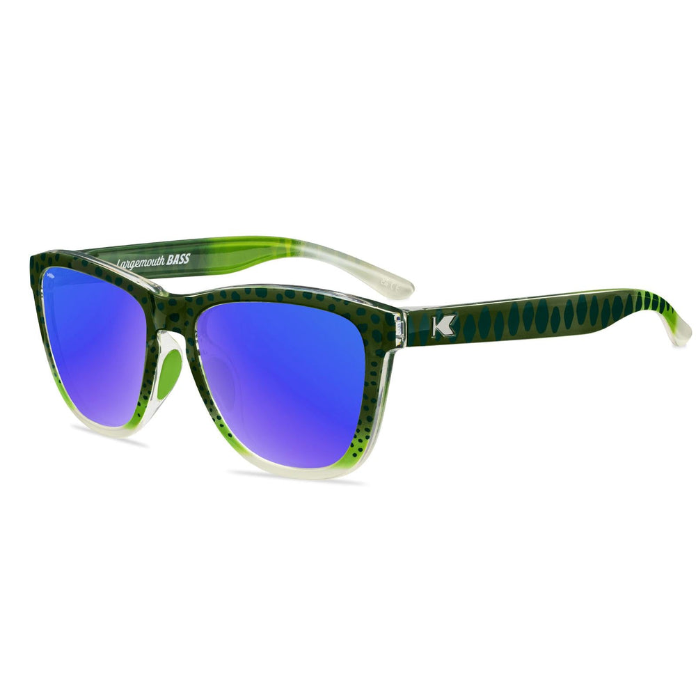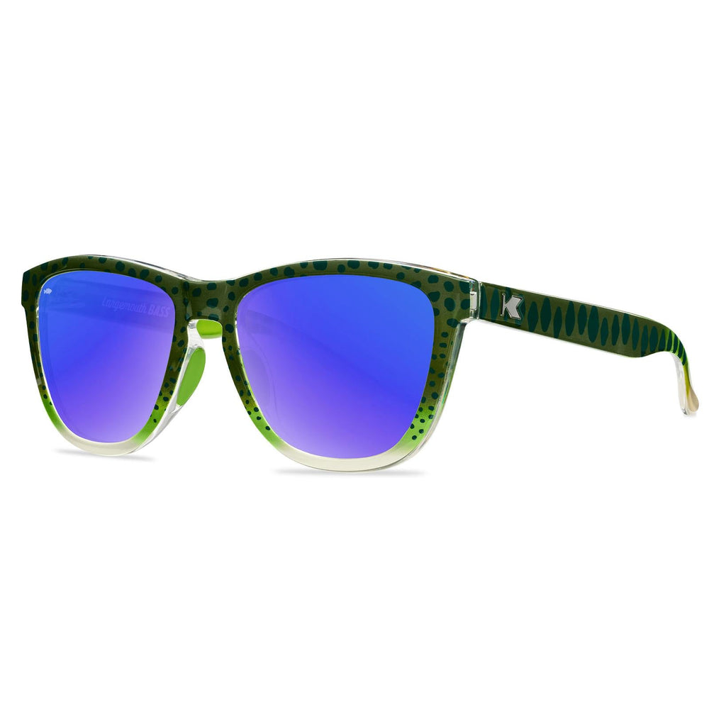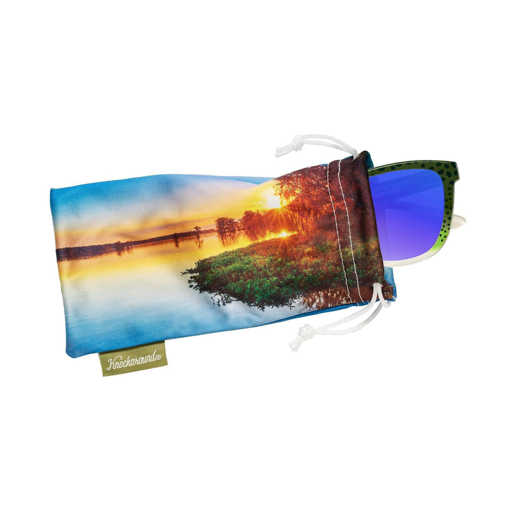 Get hooked on the unique charm of the Largemouth Bass Premiums Sport sunglasses. The speckled frame fades smoothly from a rich bass-inspired hue to a soft, natural tone, capturing the essence of a river's edge. Polarized blue moonshine lenses, etched with a subtle largemouth bass, complete the look while offering maximum glare reduction. With green embedded rubber nose pads and Knockaround’s signature silver K logos, these sunglasses are as durable as they are striking. They come with FDA compliant, impact-resistant lenses that offer full UV400 protection, plus a pristine lake-inspired microfiber pouch to keep them safe when the fishing day is done.