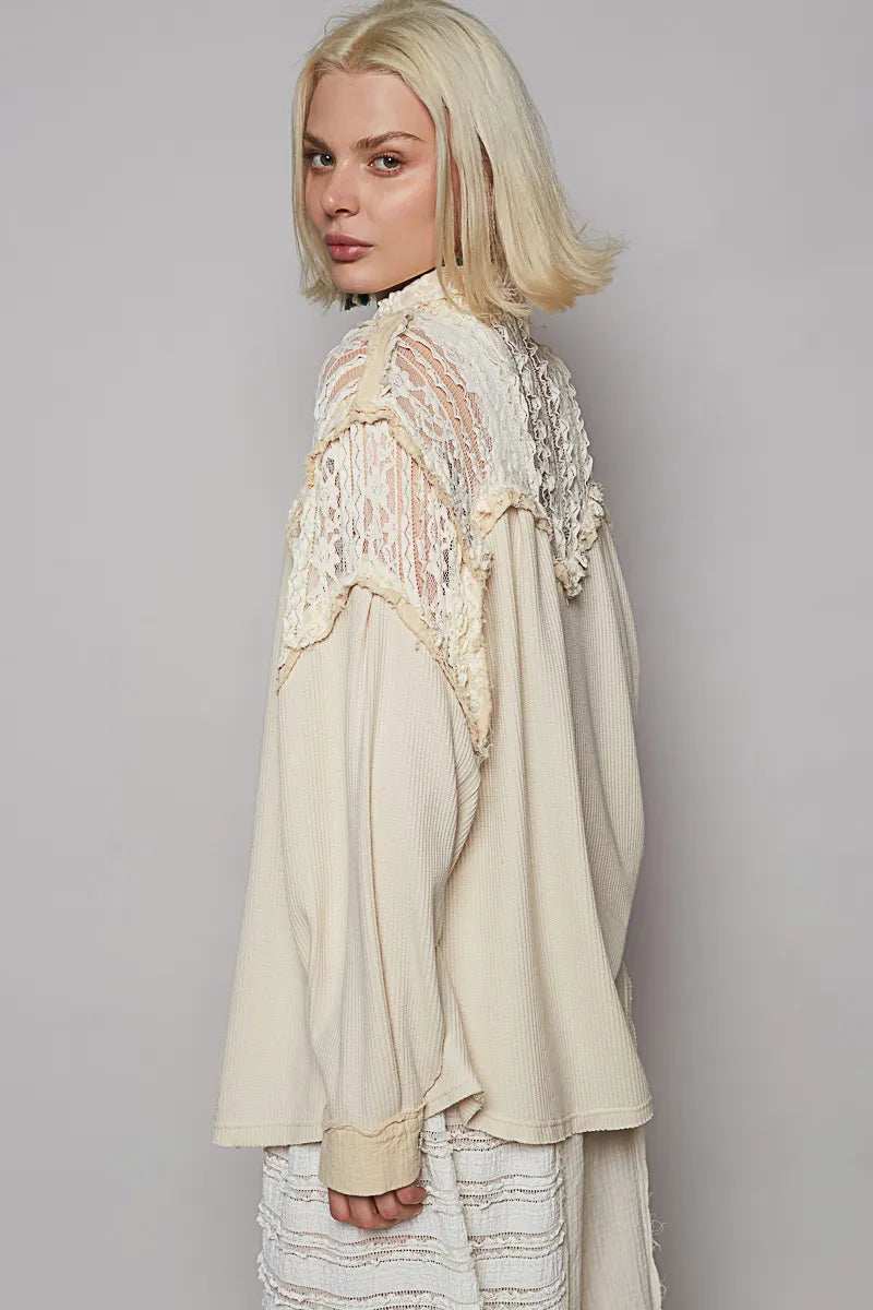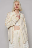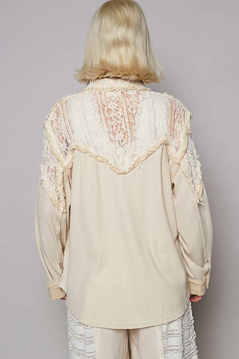 This vintage-inspired oversized utility jacket features a relaxed fit with distinctive lace trim detailing that adds feminine elegance to the casual design. Crafted from lightweight, breathable fabric in a versatile cream color, it offers both comfort and style. The jacket includes functional button-front closure and multiple pockets for practicality. Perfect for layering over casual outfits, this piece combines utility-inspired design with delicate lace accents, making it ideal for creating effortless street style looks. The oversized silhouette provides comfortable movement while maintaining a fashionable appearance suitable for various occasions.