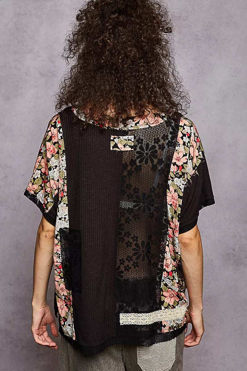 This round neck short sleeve top is designed with a relaxed fit and crafted from ribbed fabric for a textured look and comfortable feel. It features a unique patch detail of a pointed floral pattern, adding a touch of charm and uniqueness to the design. The short sleeves make it perfect for warmer weather or for layering under jackets or cardigans. This top is a stylish option for casual outings or everyday wear. The combination of the relaxed fit and the floral patch detail creates a trendy and eye-catching piece for your wardrobe.