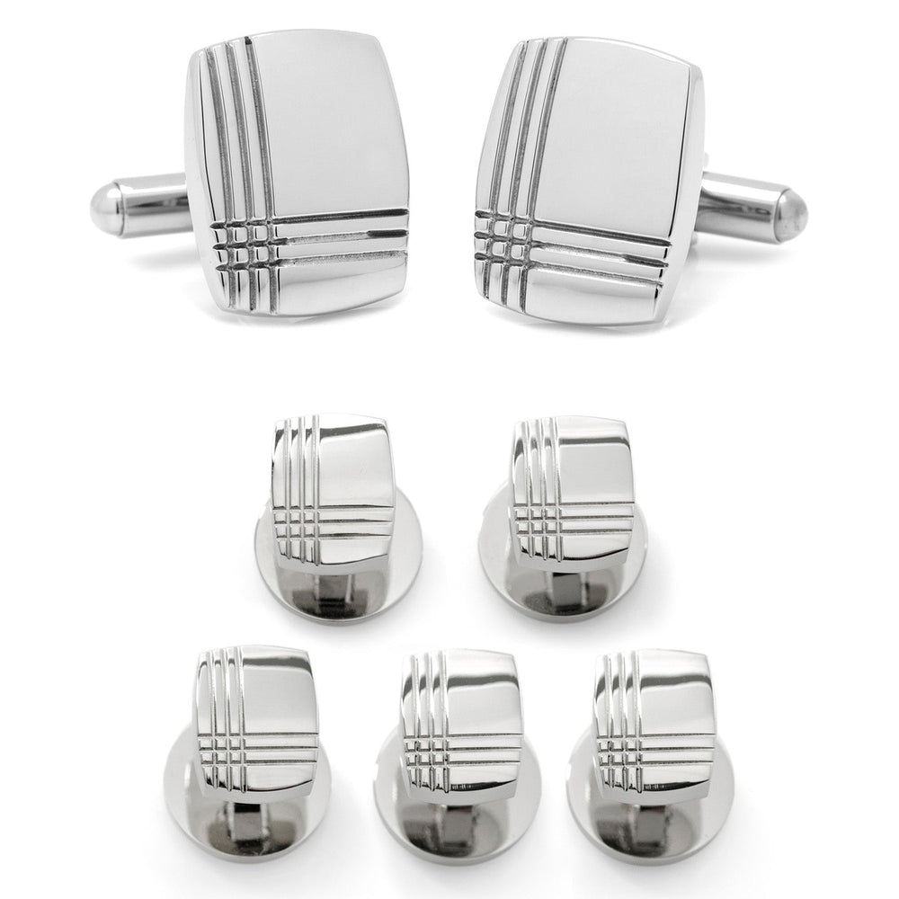 Designed with clean, simple lines, our Stainless Steel Tartan Plaid Stud Set adds a modern twist to a classic wardrobe staple. Etched into the face of the cufflinks and studs is a tartan plaid design. They are a versatile set that can be added to any outfit and for formal or casual events. Our stud set will stand up to wear and maintain its sleek, shiny look thanks to being crafted from durable stainless steel.