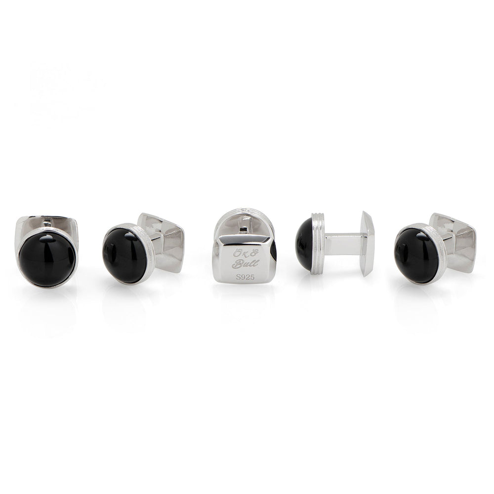 Understated, yet impactful. Opulent, round Onyx is set in polished sterling silver with ribbed sides. Specifically designed for the classy man, the quality and attention to detail in these studs make them a reliable go-to for any occasion. The expert craftsmanship of our Sterling Silver studs ensures long-lasting durability and a classic look that is sure to never go out of style. Pairs perfectly with our matching Sterling Silver Ribbed Onyx Cufflinks.