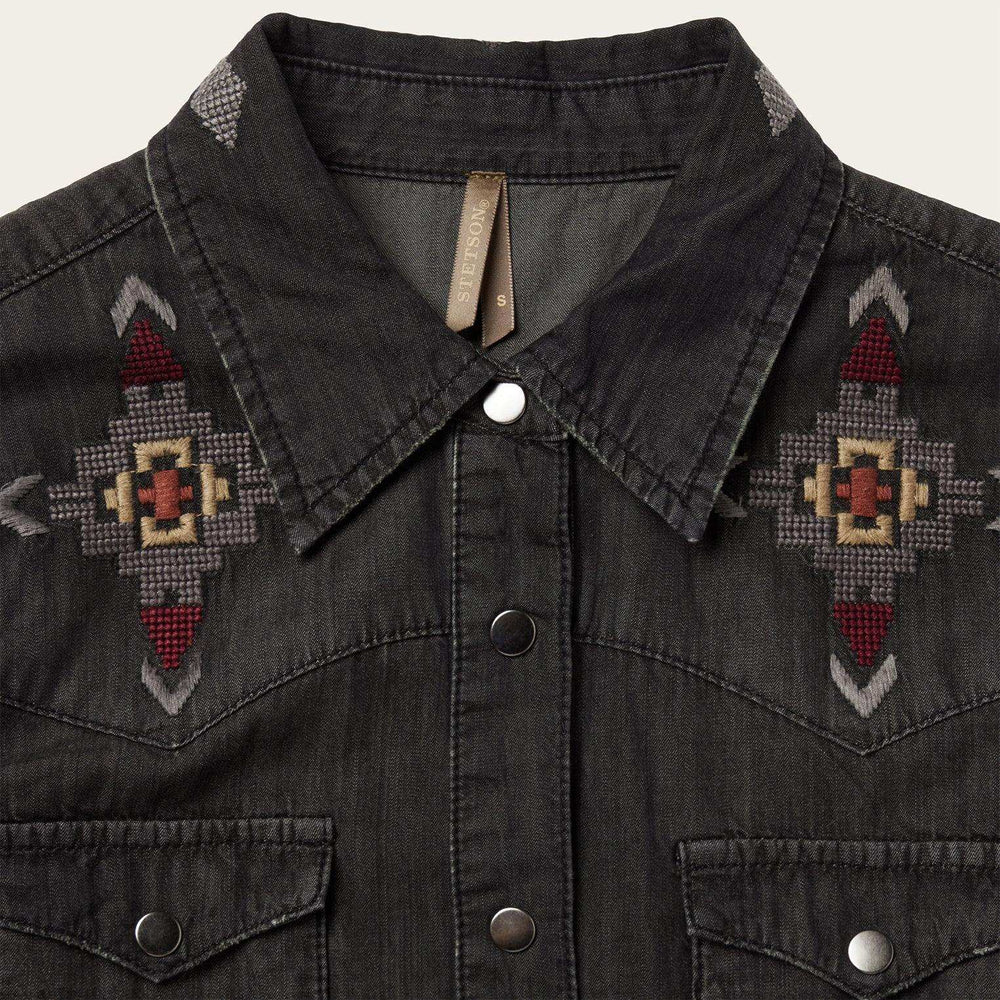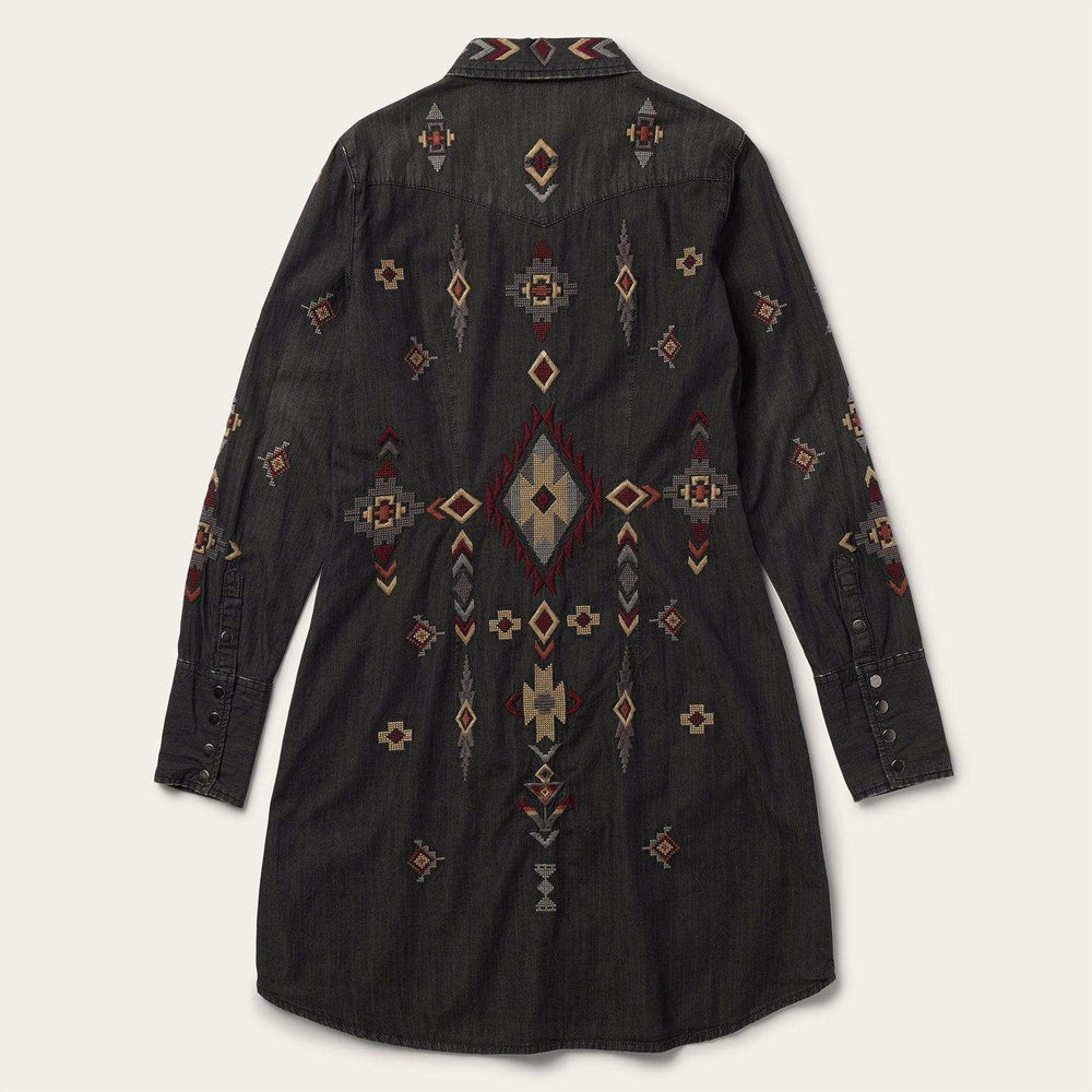 This long sleeve black denim shirt dress is crafted from 100% cotton that has been garment washed for a soft, comfortable feel that will only get better with time. Featuring a stunning all-over embroidered detail, it includes single point front and back yokes, single point front pockets with flaps and snap closures, five snap cuffs and a classic snap front. Its versatile, Western-inspired style can be worn on its own with boots or over a t-shirt and jeans.
