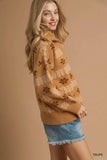 This floral patterned jacquard quarter-zip pullover sweater features a unique broken chevron and flower pattern for a stylish look. The quarter-zip collar adds a modern touch, while the long sleeves come with ribbed cuffs for a comfortable fit. The ribbed hem ensures a snug and cozy silhouette, perfect for chilly days. Please note that this sweater is not lined, allowing for breathability and layering options.