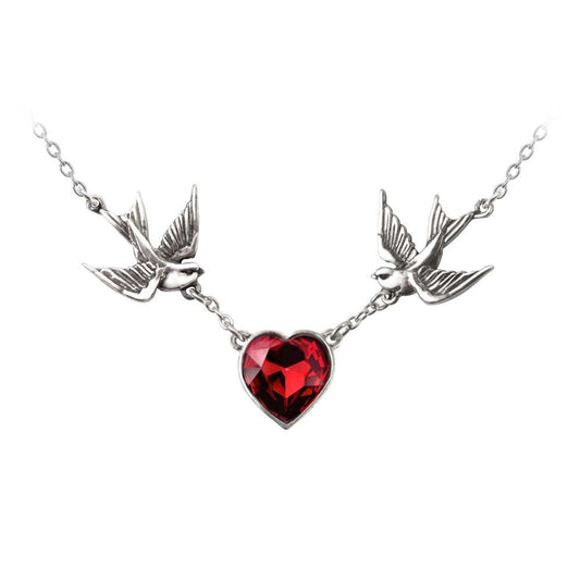 Two tattoo-style swallows holding a red crystal heart; on silver finish chain. Width 2.52" x Height 1.77" x Depth 0.43" Approx.- $55.22 USD
