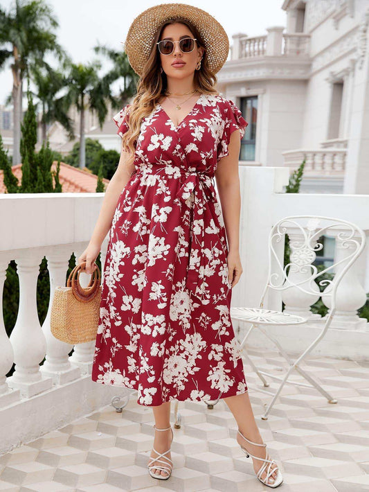 Plus Size Floral Tie Waist Surplice Neck Midi Dress