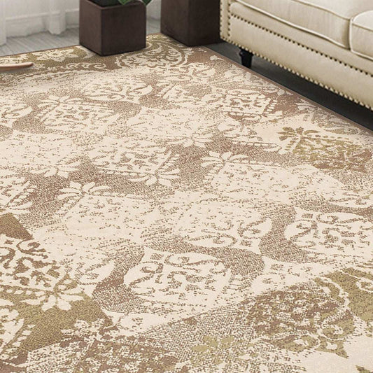 2' X 3' Beige Damask Power Loom Distressed Stain Resistant Area Rug