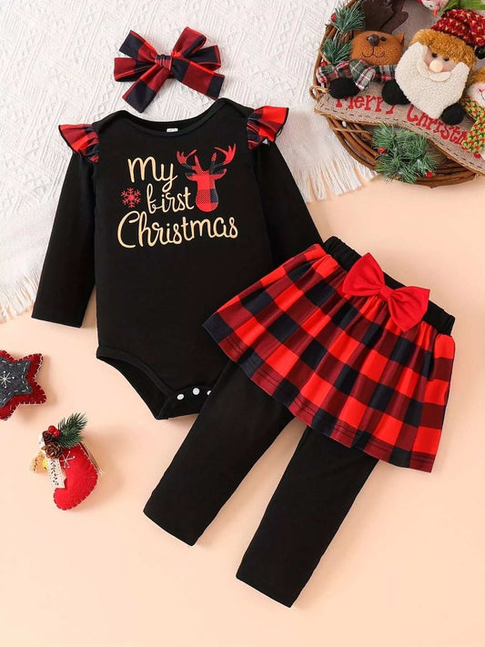 Features:Ruffled,Bow Number of pieces:Three-piece Material composition:95% polyester, 5% spandex Care instructions:Machine wash cold. Tumble dry low. Imported Product Measurements (Measurements by inches) & Size Conversion Size Top Length Bust Shoulder Waist Bottom Length Hip Sleeve Length 0-3M 14.6 18.1 7.5 14.2 15 0 0...- $32.94 USD