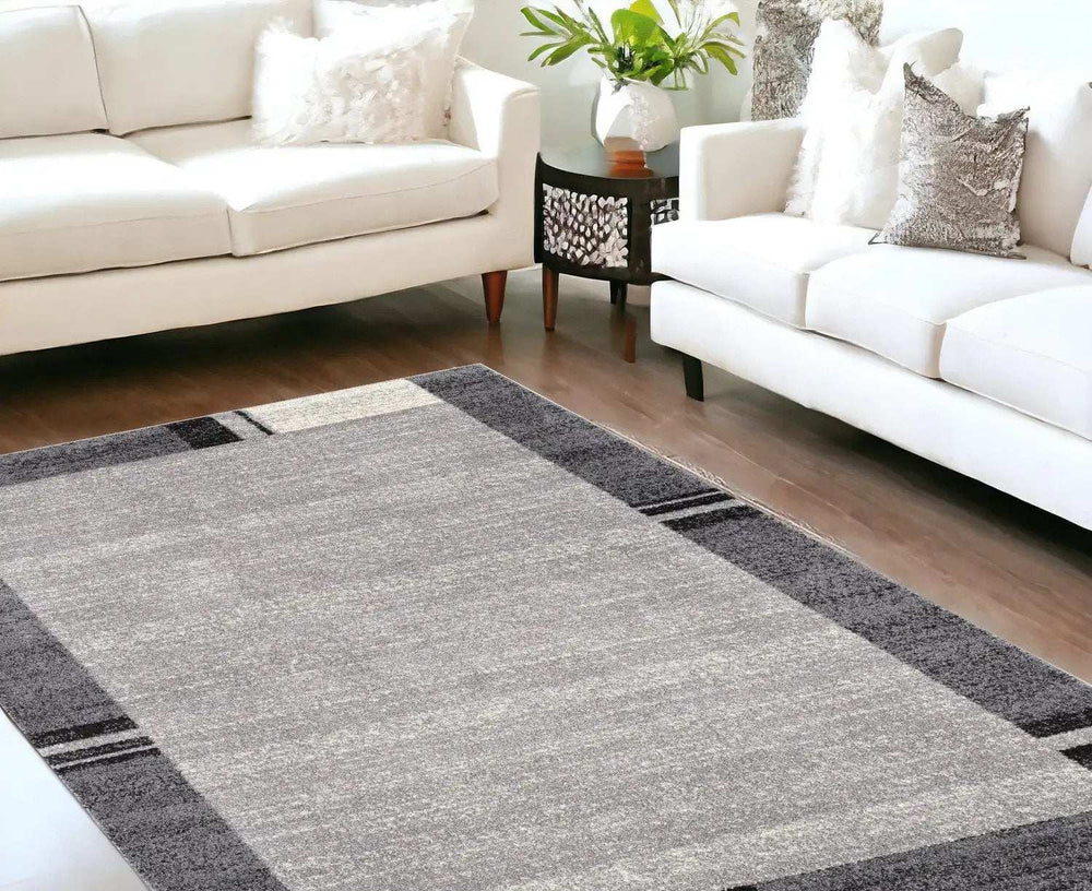 Esta alfombra gris moderna con borde muestra la máxima sofisticación en su aspecto sencillo y creará un ambiente relajante en su espacio vital moderno. La base sólida desgastada con un efecto desgastado gris paloma se realza con un marco geométrico de líneas limpias para agregar un toque elegante a cualquier entorno contemporáneo. Esta alfombra de fabricación turca está tejida con polipropileno 100 % trenzado, lo que habla de su durabilidad para durar mucho tiempo y resistir las manchas para mantener su aspecto prístino con un bajo mantenimiento. Ahora puede experimentar una superficie suave y suntuosa bajo los pies debido al pelo alto que se suma al interés de la superficie, lo que la convierte en una excelente opción para su dormitorio, pasillo o sala de estar. Si está buscando un acento elegante para transformar su espacio interior sin ser demasiado llamativo, ¡esta alfombra de tono neutro es la elección perfecta para usted! 126” x 93” x 0.8”