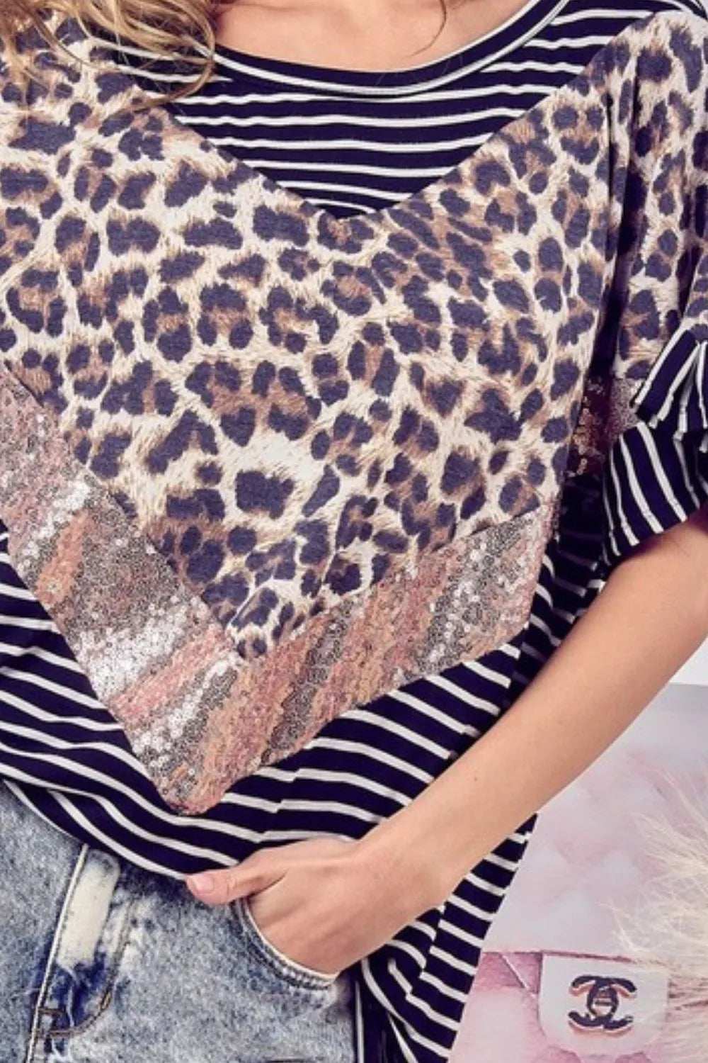 The Stripe Rayon Span Knit Color Block Top with Leopard is a trendy and eye-catching piece for your wardrobe. With a unique combination of stripes and color blocking, this top offers a stylish and modern look. The leopard print adds a bold and playful touch to the design. Pair this top with jeans or leggings for a chic and fashion-forward outfit that is sure to turn heads.