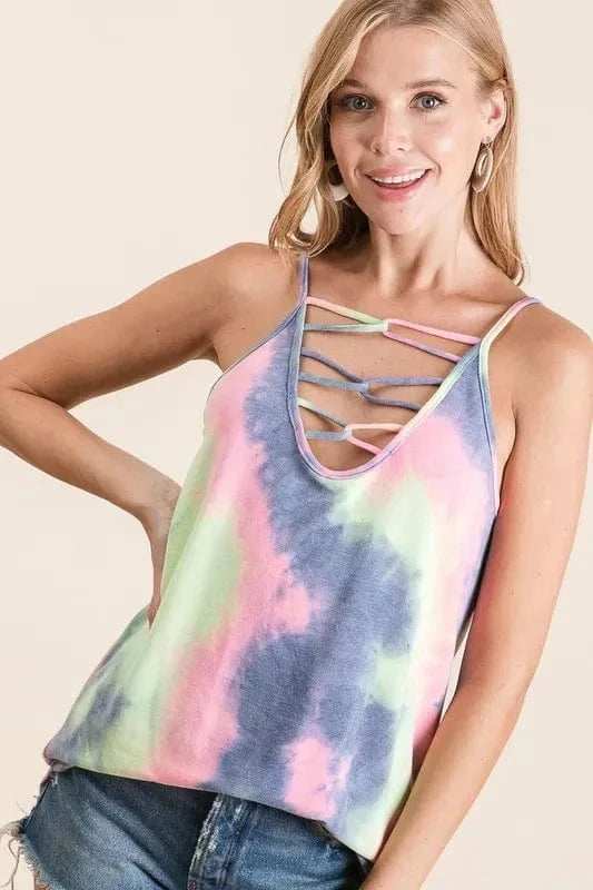 This tie-dye terry camisole with a caged neck is a trendy and fun addition to your summer wardrobe. The tie-dye pattern gives a playful and colorful look to the camisole, perfect for warm days. The caged neck design adds a touch of edginess and style to the top. Made from terry fabric, this camisole is comfortable and lightweight, great for layering or wearing on its own. Stay cool and fashionable in this chic tie-dye terry camisole with a caged neck.