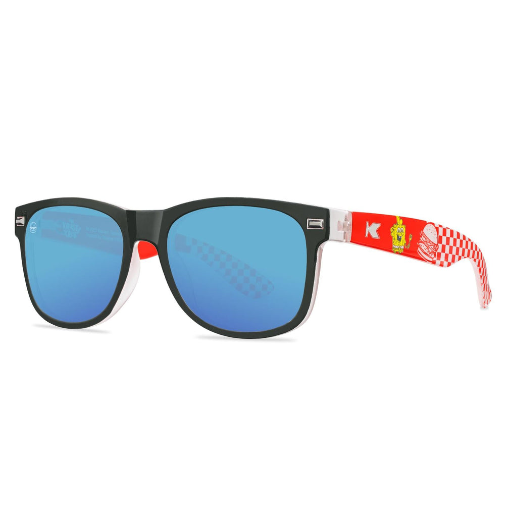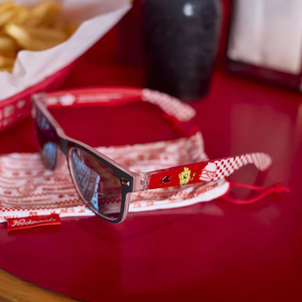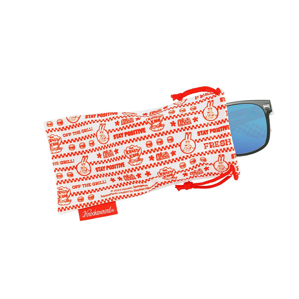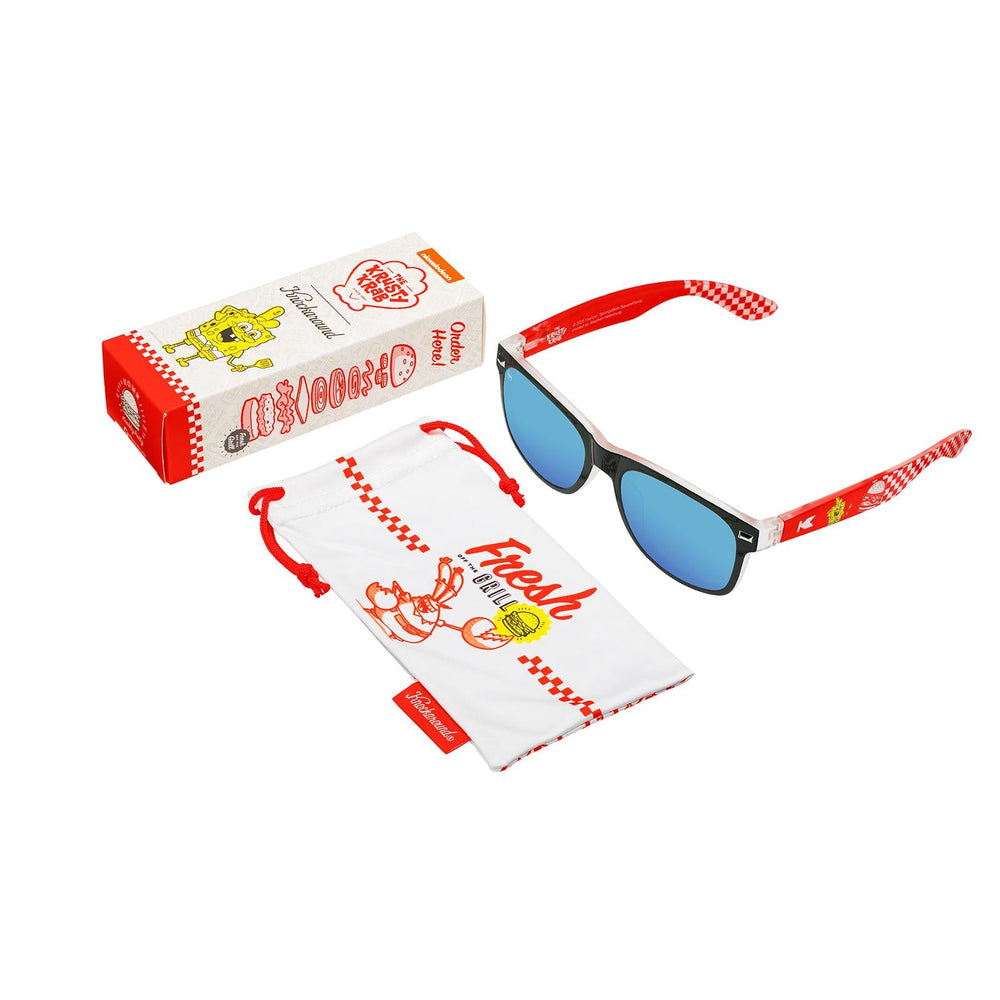 Get ready to grill up some fun with the Krusty Krab Fort Knocks! Designed on our Fort Knocks frame style, these sunglasses boast a glossy red and dark gray exterior and a frosted, matte interior, mimicking steam rising off a hot grill. The vibrant red checkerboard arms feature jolly SpongeBob and the iconic Krusty Krab sign, bringing a piece of Bikini Bottom right to your look. Silver bar details on the front and matching silver K logos on the arms add a touch of shine, complementing the polarized lenses that ensure your day is as clear as it is fun.