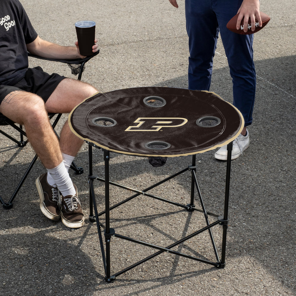 The Round Table is just what the ultimate fan needs for a truly exceptional tailgate party. Made of a powder-coated steel with cross beams, it is sturdy and can hold multiple dishes. Your favorite team's logo is screen printed on the durable polyester 27.6"diameter table surface, which includes four built-in mesh cup holders. This table is portable, folding up easily for storage and transport. It works great for camping, picnics, deck parties and other outdoor activities. The table height matches most Logo Brand chairs. It comes with a convenient matching carrying bag with handles and tear-away label. The table assembles in seconds.