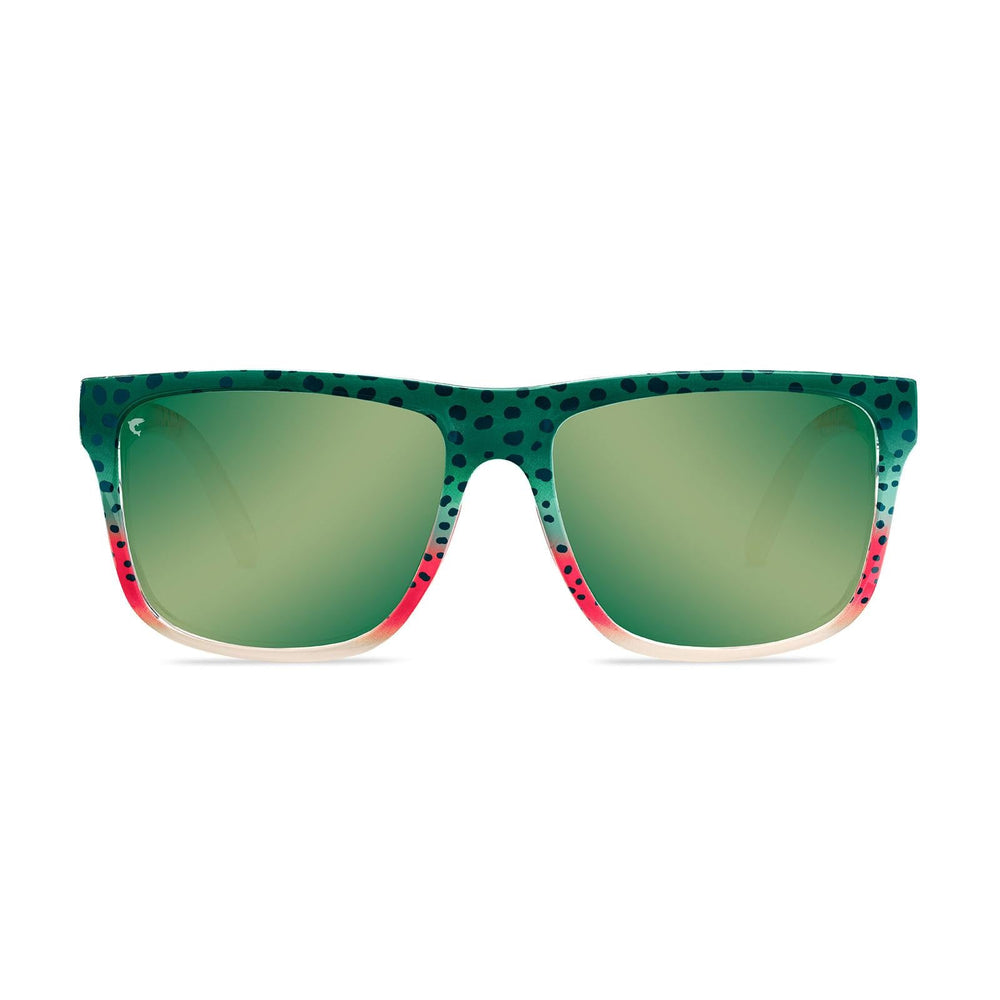 The Rainbow Trout Torrey Pines Sport sunglasses bring the vibrancy of the wild to life. Blue-green at the top of the speckled frame fades gently to crimson before ending in translucent beige along the arms. Top it off with a light blue interior for a look that comes straight from the streams of Montana. Polarized olive green lenses etched with a rainbow trout silhouette provide optimal glare reduction, making them as functional as they are eye-catching. Finished with silver K logos and pink embedded rubber nose pads, these shades combine rugged style with superior comfort. With FDA compliant, impact-resistant lenses and full UV400 protection, they’re ready for any adventure and come with a babbling river microfiber pouch for safe keeping.