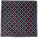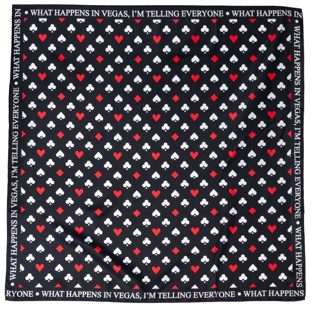 This sleek black polyester scarf features a repeating pattern of red and white card suits, bordered by a cheeky twist on the classic phrase: “What happens in Vegas, I’m telling everyone.” Soft, lightweight, and full of personality, it’s a standout accessory for gamblers, partygoers, and anyone who brings the fun wherever they go.